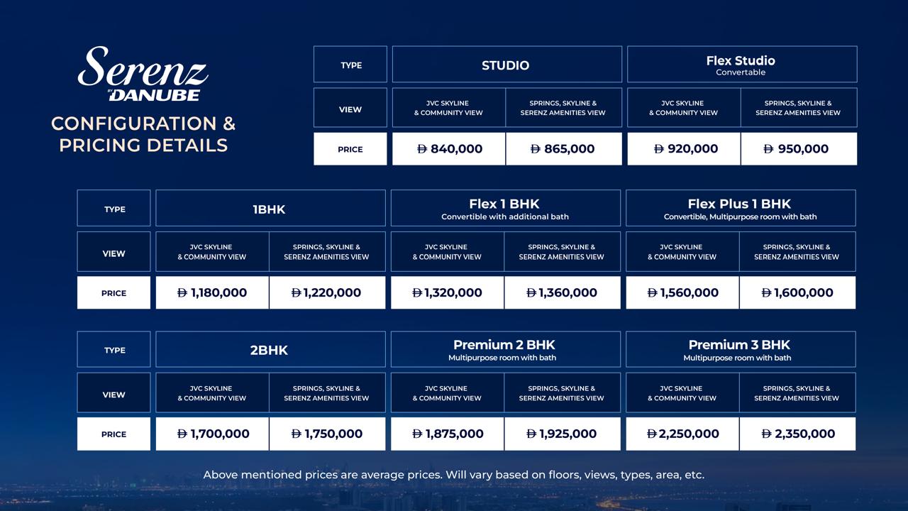 Danube Properties presents SERENZ by Danube, a fully furnished residential development in the heart of Jumeirah Village Circle (JVC). Just 2 minutes in & out of Al Khail Road (E44) and Sheikh Mohammed Bin Zayed Road (E311). WORLD OF AMENITIES, Enjoy a resort-style lifestyle with 40+ world-class amenities.